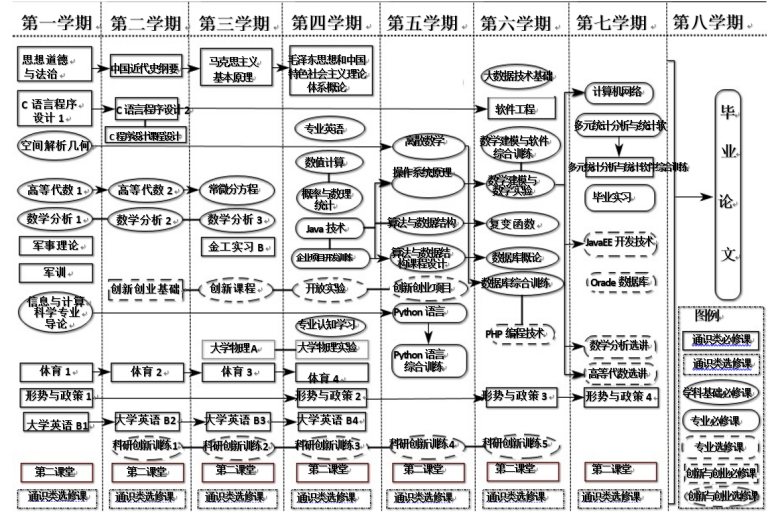 数学分析、高等代数、概率论与数理统计、复变函数与积分变换、数学模型与数学实验、算法与数据结构、数值计算、操作系统原理、计算机网络、Java技术、JavaEE开发技术、Python语言、多元统计、大数据分析。