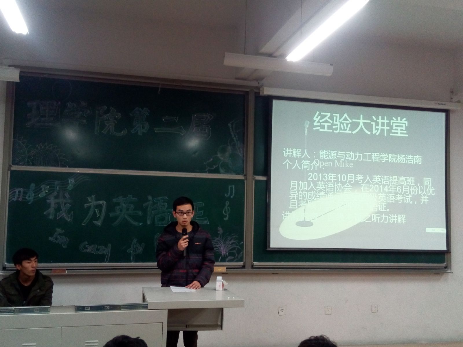 本次活动融趣味性、学习性、挑战性于一体。活动分为六个小组,三个趣味挑战项目,中间穿插了英语学习经验讲座以及英文歌曲演唱。活动的第一个环节为“心有灵犀一点通”:由每队队长抽出一个单词并用肢体语言表达出来一次传下去如最后一位队员在规定时间内正确答出则获胜;第二环节为“英语小测试”:由工作人员组织一次纸质测试;第三环节为“吹气球回答问题”每队派出两位队员参加比赛,其中一人吹气球,先吹破气球的两对获得答题机会,另一人问题答案,答对者获胜。大家积极参与,现场气氛热烈,活动取得了圆满成功。